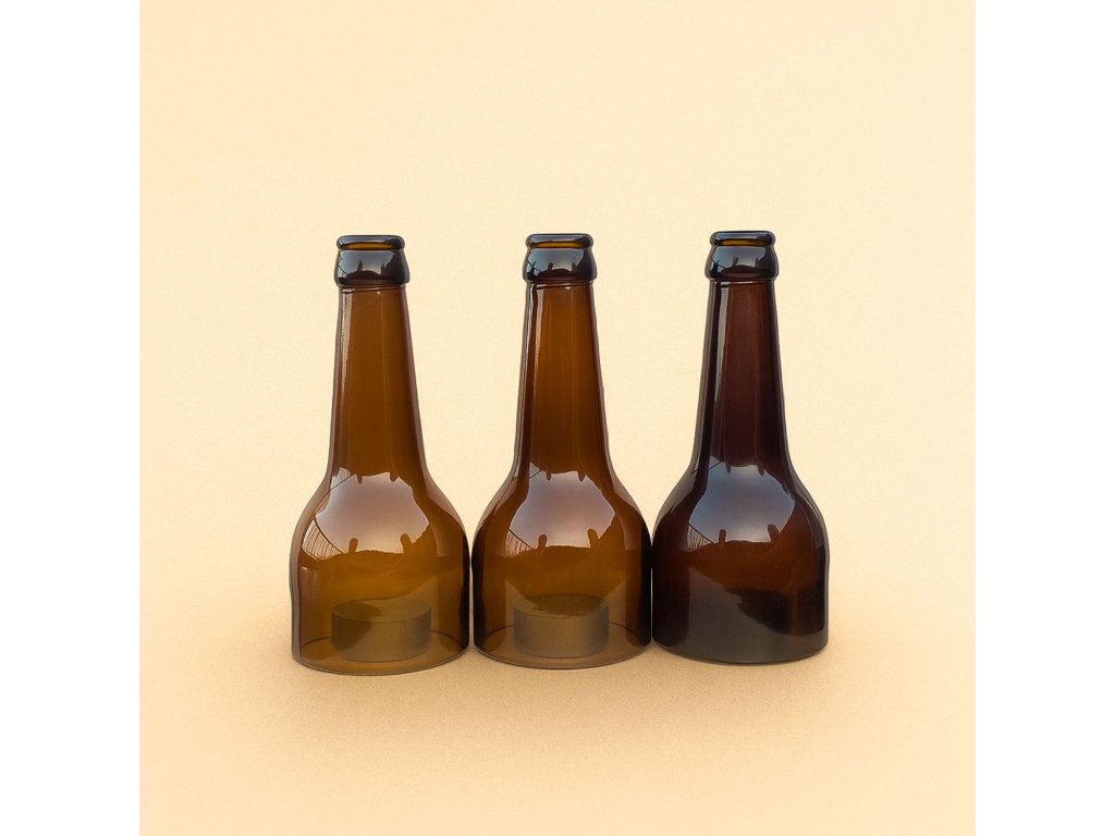 Tři ručně řezané stojany ze starých pivních lahví, které dostaly nový smysl – jako minimalistické držáky na čajové svíčky. Každý kus je jedinečný, vyrobený s respektem k řemeslu i přírodě.